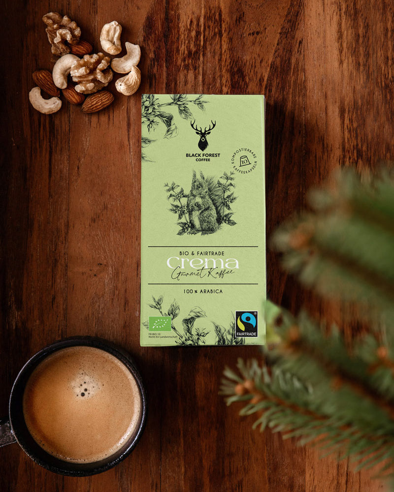 Genieße Premium Schwarzwaldkaffee. Wähle zwischen ganzen Bohnen oder kompostierbaren Kaffeekapseln.