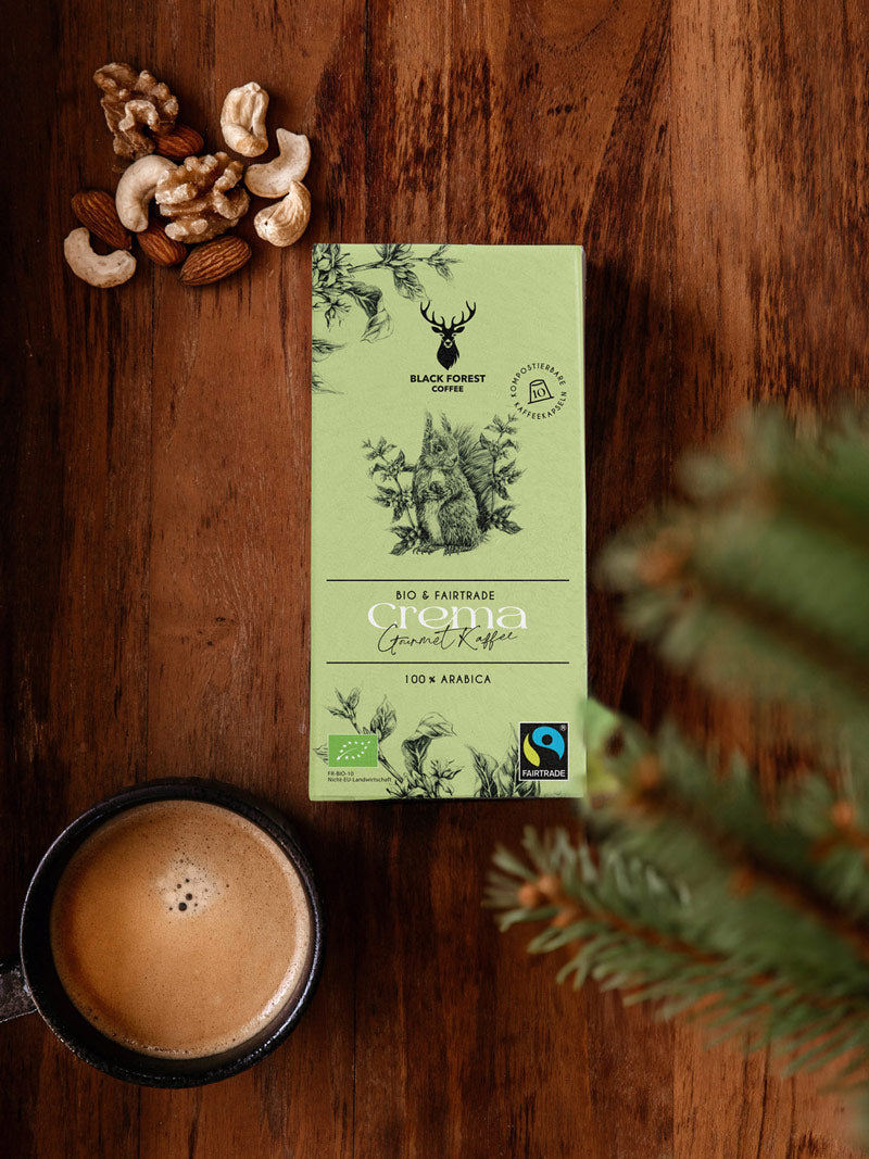 Genieße Premium Schwarzwaldkaffee. Wähle zwischen ganzen Bohnen oder kompostierbaren Kaffeekapseln.
