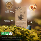 Nachhaltigkeit unserer Ressourcen, der Verträglichkeit von Biomaterialien und den Entsorgungsoptionen. Unsere Kapseln zersetzen sich innerhalb von 26 Wochen zu 90% und sind innerhalb von 12 Monaten zu 90% in deinem heimischen Kompost kompostiert.