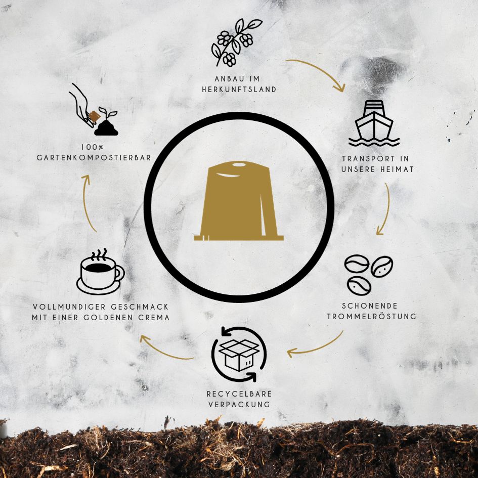 Unsere Kaffeekapsel bestehen aus aus einem natürlichen Material hergestellt aus biobasierter Zellulose und Pflanzenölen.